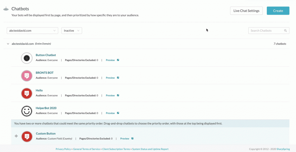 Je kan dus meerdere chatbots op een website hebben. Zo kun je verschillende doelgroepen aanspreken die zich in verschillende fases van de buyer journey begeven en dus verschillende vragen of problemen ervaren. Het kan daardoor wel voorkomen dat verschillende chatbots dezelfde gebruiker willen aanspreken (bijvoorbeeld omdat het zowel een klant is als een terugkerende bezoeker). Om te voorkomen dat dit mis gaat, is het belangrijk om prioriteit in de chatbots aan te geven.